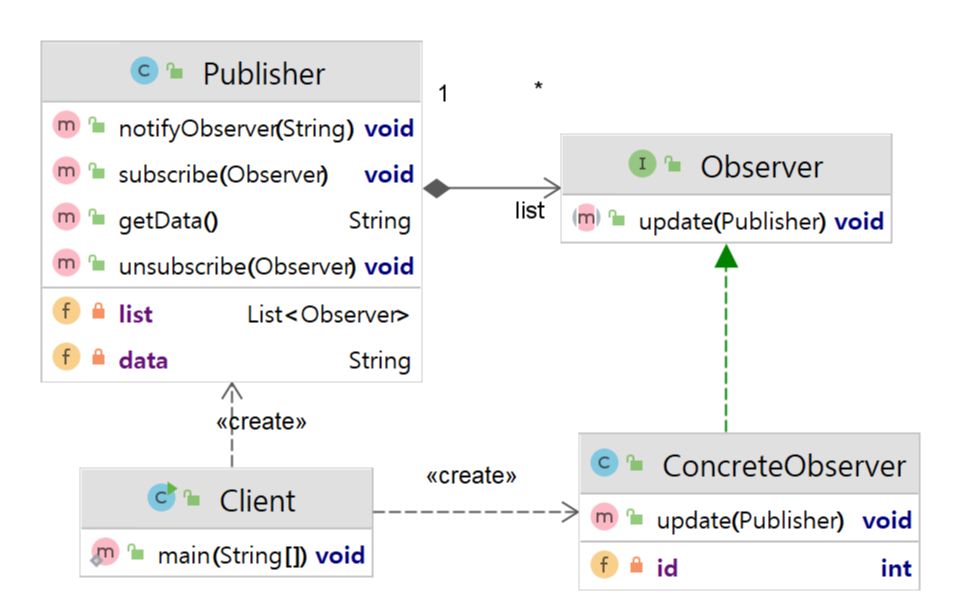 Publisher 클래스는 Observer 인터페이스를 구현하는 클래스들의 List를 가지며 subscribe(), unsubscribe()로 추가, 제거할 수있다. 값을 subscriber들에게 전달하고 싶다면 notifyObserver() 함수를 통해 List에 저장된 Observer 구현클래스들에게 일률적으로 update() 함수를 호출한다